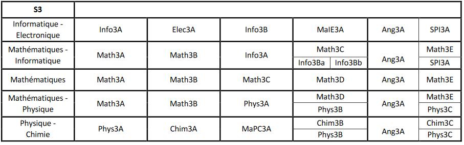 Le schéma ci-dessous indique la ou les disciplines dominantes de chaque semestre, les parcours possibles et les passerelles éventuelles.Les parcours des semestres 1et 2 sont détaillés ensuite. Pour les semestres 5 et 6 ne sont indiquées que les licences généralistes auxquelles conduisent ces parcours.