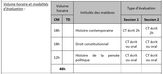 Au premier semestre, elle propose une solide formation en histoire, à travers d’une part l’étude d’une question d’histoire contemporaine sur les enjeux environnementaux, intitulée « Politiques et réglementations environnementales (XIXè-XXè s) » et, d’autre part, un cours d'histoire de la pensée politique. Y est associée une initiation au droit constitutionnel, à partir d’une réflexion sur la théorie générale de l’État et les différents régimes politiques.