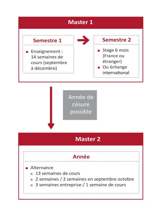 L'année de M1 s’effectue en formation initiale avec un semestre intensif de cours et un semestre de stage. L’année de M2 s'effectue en alternance avec 13 semaines pleines de cours à l’IAE. Une année de césure est possible entre le M1 et le M2 pour les étudiants qui souhaitent donner une orientation internationale à leur CV.